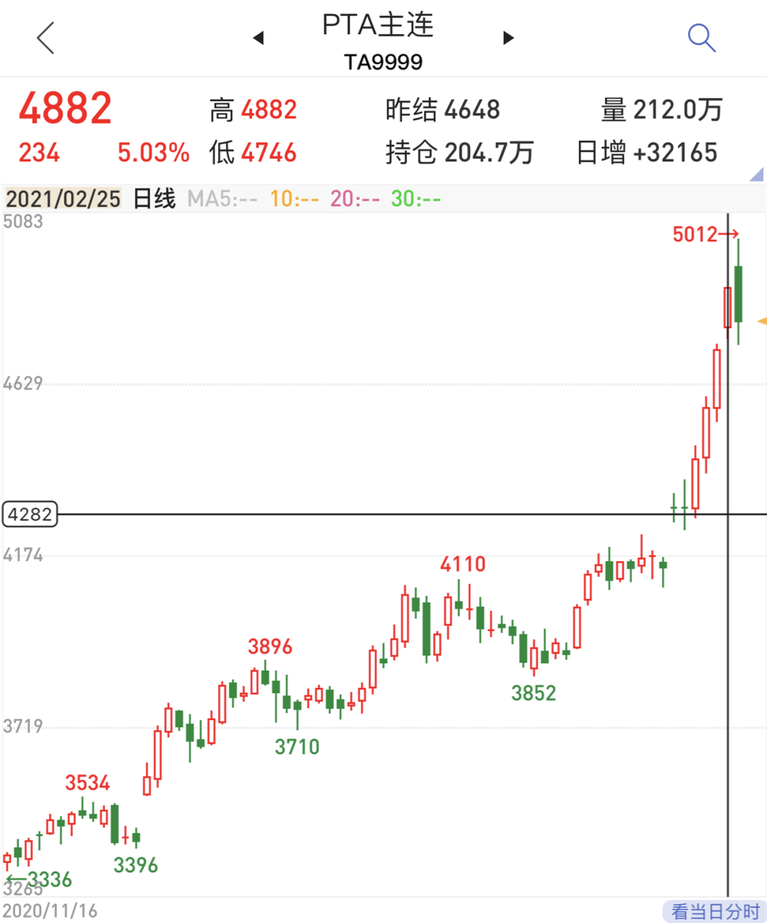 化工板块情绪高涨,2月25日国内期市多数品种高开,20号胶主力合约延续昨夜涨势,涨停开盘,橡胶主力合约涨逾6%,PTA主力合约涨停,乙二醇、沥青主力合约涨逾5%。其中PTA价格异常活跃,23日盘中多次触及涨停,25日05合约开盘再度涨停至4882元/吨。